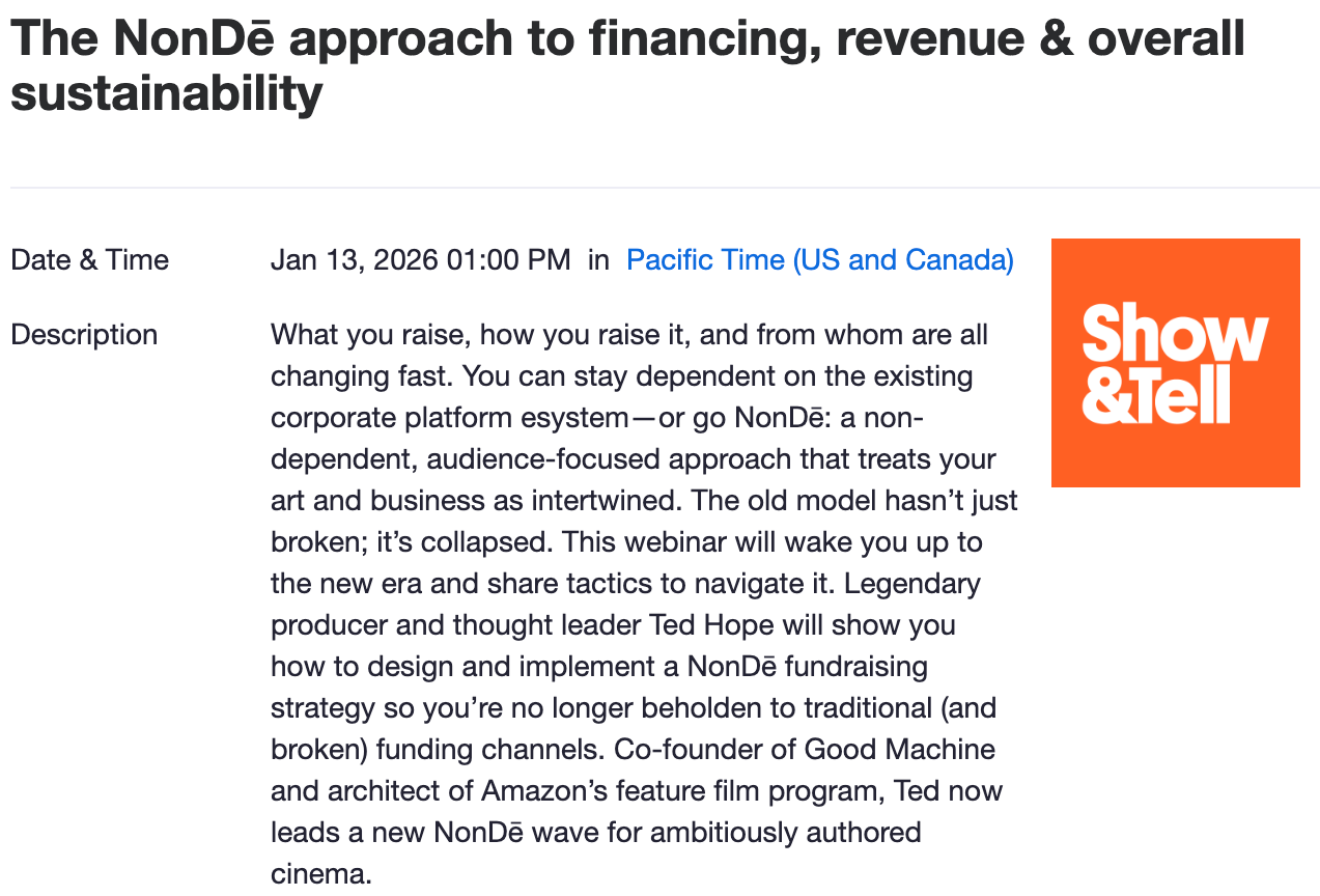 I am having a public conversation (aka a webinar) with Show&Tell’s Keith Ochwat on NonDē financing. And it is not too late to sign up. It’s free. Register here: https://us06web.zoom.us/meeting/register/sq-q5S-XSdC4lzvoJ-CHXw
