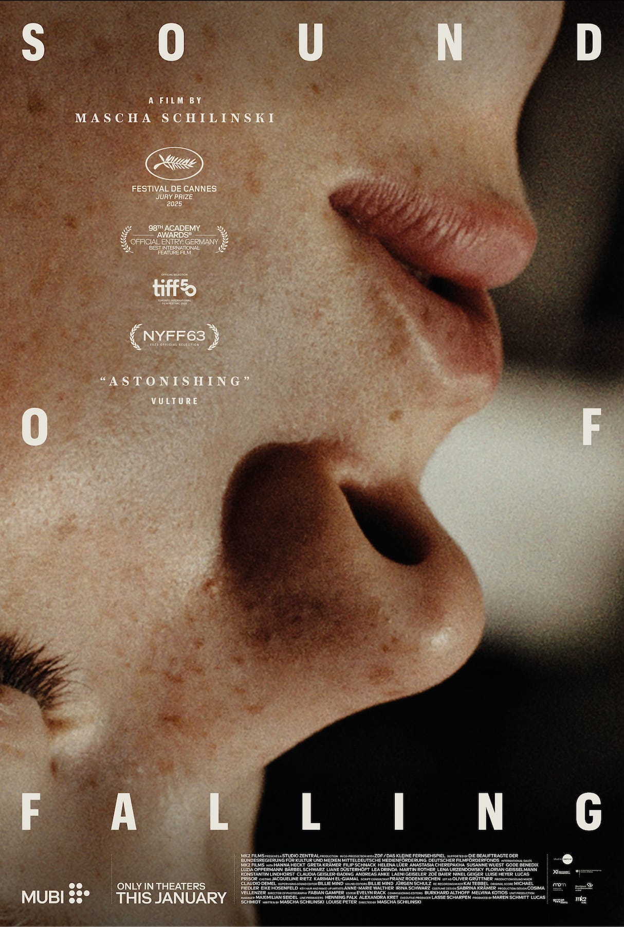 And of course, sound is crucial in the film. We worked with wonderful sound artists—Billy Mind, Jürgen Schulze‑Tabell, Michael Fiedler, Eike Hosenfeld. I already had the “sound of falling” in my head while writing. In the edit, we kept asking: how do we find that sound—a sound that sometimes knows more than the characters, almost like a witness who never forgets, while the characters are trying to repress things in order to survive.